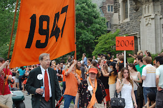 Alumni from the classes of 1925 to 2007 joined the Class of 2008 in the P-Rade this afternoon as they marched down campus. The Class of 1983 led off the parade accompanied by drummers. A Class of 1938 Volvo and convertible processed along with a striped VW bug.
